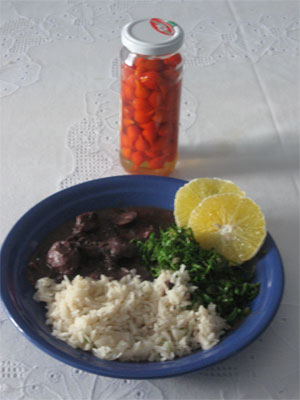 Hoje o ilustre jornalista José Moralez faz aniversário… em comemoração eu e sua filha, Maria Olívia, tiramos do freezer uma autêntica feijoada preparada por ele ( que estava hibernando ) … Fiz questão de fazer o arroz e a couve ( sob a atenta observação de minha fiel escudeira ) … para acompanhar laranja , farinha e pimenta biquinho ( presente do Rodrigo ) .