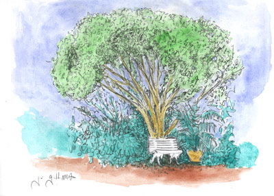 Fui passar o feriado na casa dos pais da minha cara metade … lá desenhei esta pitangueira , que foi plantada por ela e por seu pai, há muito tempo atrás e que agora está a fazer sombra para este simpático banquinho .