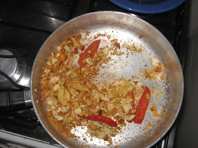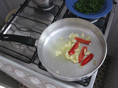 Coloque oito colheres de sopa de azeite em uma frigideira em fogo baixo, acrescente sete dentes de alho descascados e amassados e uma ou duas pimentas vermelha (não esqueça de tirar as sementes).