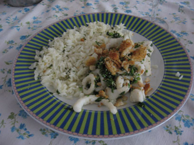 Na hora de servir coloque as lulas e as rodelas de limão ao lado de uma bela porção de arroz… depois despeje a farofa de migalhas-alhos-e-pimentas sobre a lula e adicione bastante salsinha picada.
