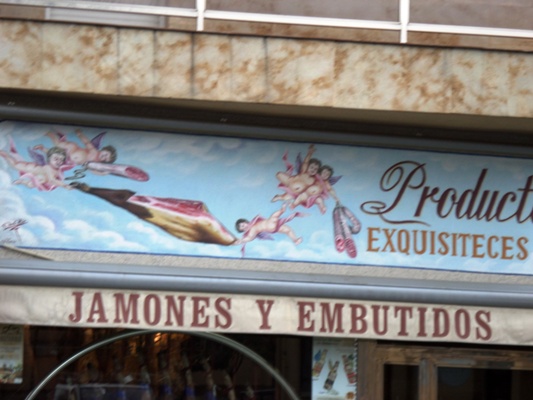 … na saída vimos este letreiro, no qual uma perna de jamón é transportada aos céus por uma micro-legião de anjos…
