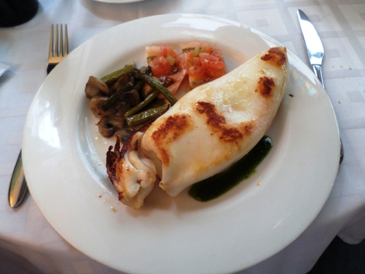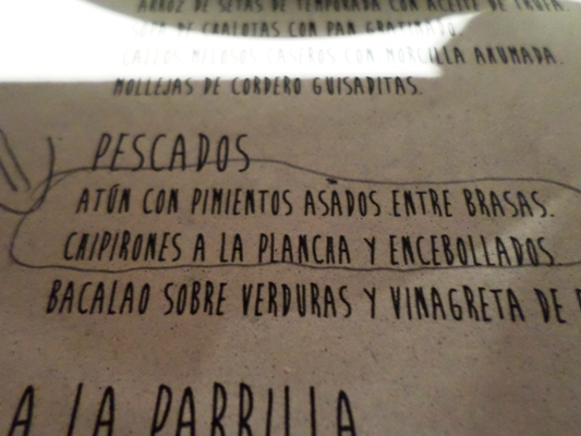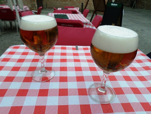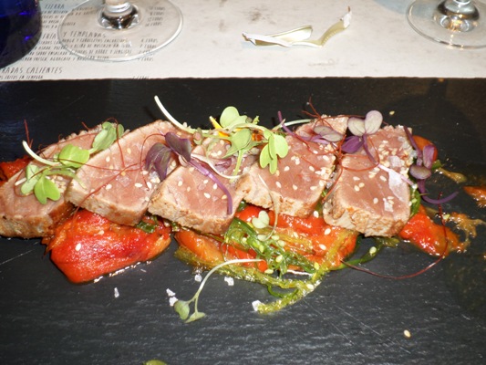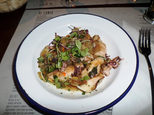 Depois de tantos monumentos fomos comer: Atún con pimientos asados entre brasas y Chipirones a la plancha y encebollados… acompanhados por jerez e cerveja…