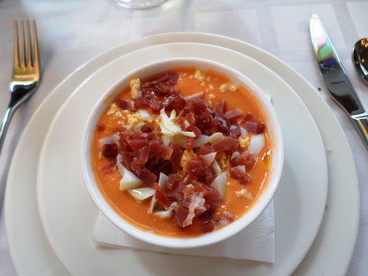 …Para começar vinho Montilla (espécie de Jerez) e Salmorejo (uma espécie de gazpacho com ovo cozido e pedaços de jamón)…