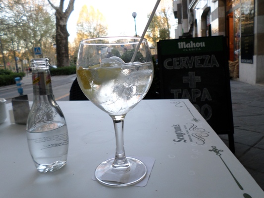 A moda agora na Espanha é tomar gin-tônica… existem vários tipos de gin e de tônicas… na calçada do nosso hotel em Granada apreciei um feito com gin francês Cidatelle e tônica com pimenta rosa…uma delícia!!!