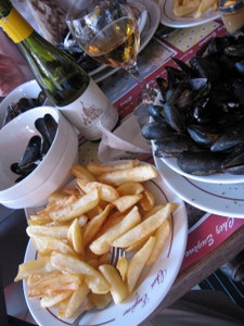 … outra coisa que comemos em Paris foram as Moules (na verdade este é um prato belga, porém muito popular por aqui), que são cumbucas de mariscos cozidos com vinho branco e temperos, acompanhadas com batatas fritas… para acompanhar vinho branco ou cerveja…