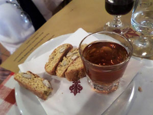 Uma tradição fiorentina na sobremesa é comer um biscoito de amêndoas chamado Cantucci acompanhando de uma espécie de vinho moscatel que eles chamam de Vin Santo… é uma delícia….
