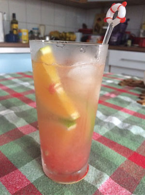 Coloque as rodelas de laranja e o gelo moido em um copo alto, despeje o gin, ponha o açúcar e mexa. Despeje então o suco de grapefruit e pigue as gotas de angostura. Mexa novamente.